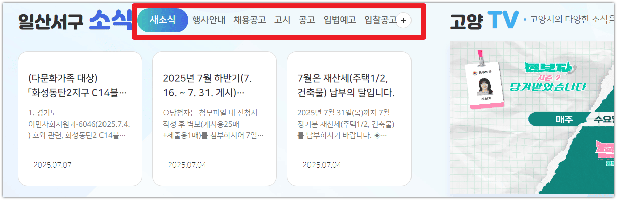 페이지 하단에는 일산서구 소식, 채용공고, 고시공고 등도 확인할 수 있습니다.