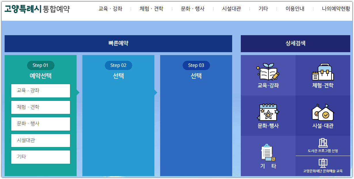 ‘통합예약’ 기능을 통해 구청 시설과 프로그램을 온라인으로 예약할 수 있습니다. 회의실, 교육장, 주민 행사 등의 공간 예약이 가능하며, 예약 상태·시간대도 바로 확인할 수 있습니다.